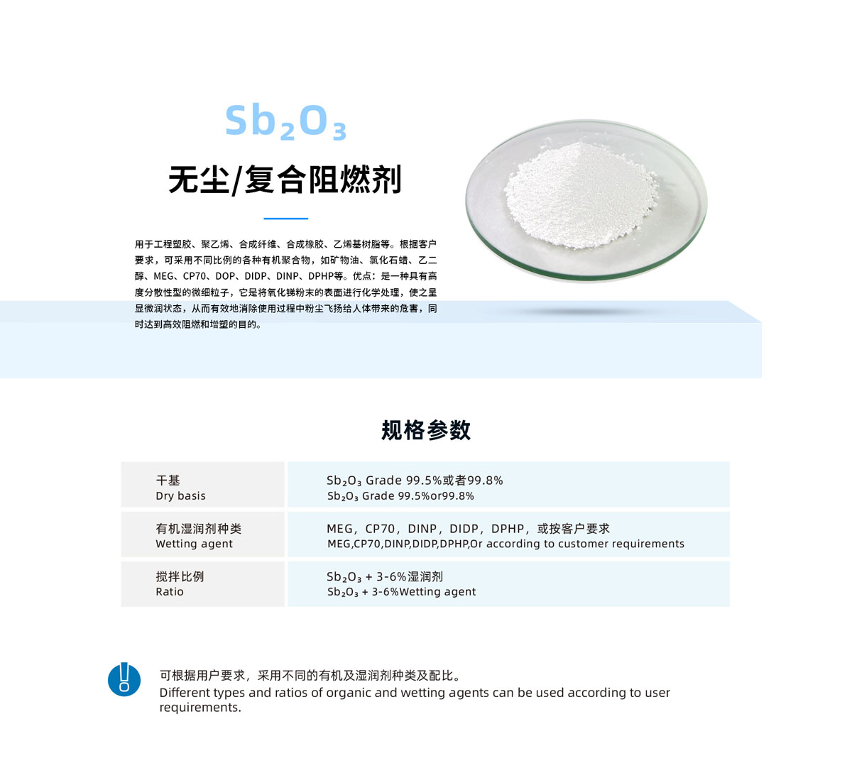 用作塑料、橡膠、油漆、涂料、合成樹脂、紡織、化纖等材料的阻燃添加劑。用于光伏玻璃的澄清劑,以除去熔融玻璃中的隱藏空氣。用作聚酯PET合成縮聚反應的催化劑;用作石油催化裂化和催化重整過程中的鈍化劑。用作搪瓷與陶瓷制品中作覆蓋劑和增白。
